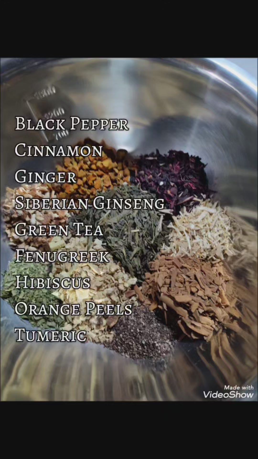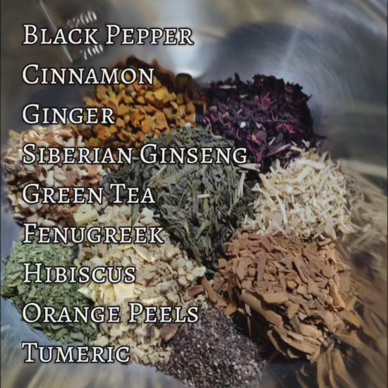 Black Pepper, Cinnamon, Ginger, Ginseng, Green Tea, Fenugreek, Hibiscus, Orange Peel, Turmeric